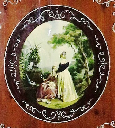CAIXA :De cirerer dels anys setanta ; confeccionada  a ma  per  l’expert Ebenista  de  Sant  Feliu de Guíxols  Sr. Fidel  Larumbe. Dibuixos  florals pintats a ma en pintura especial.