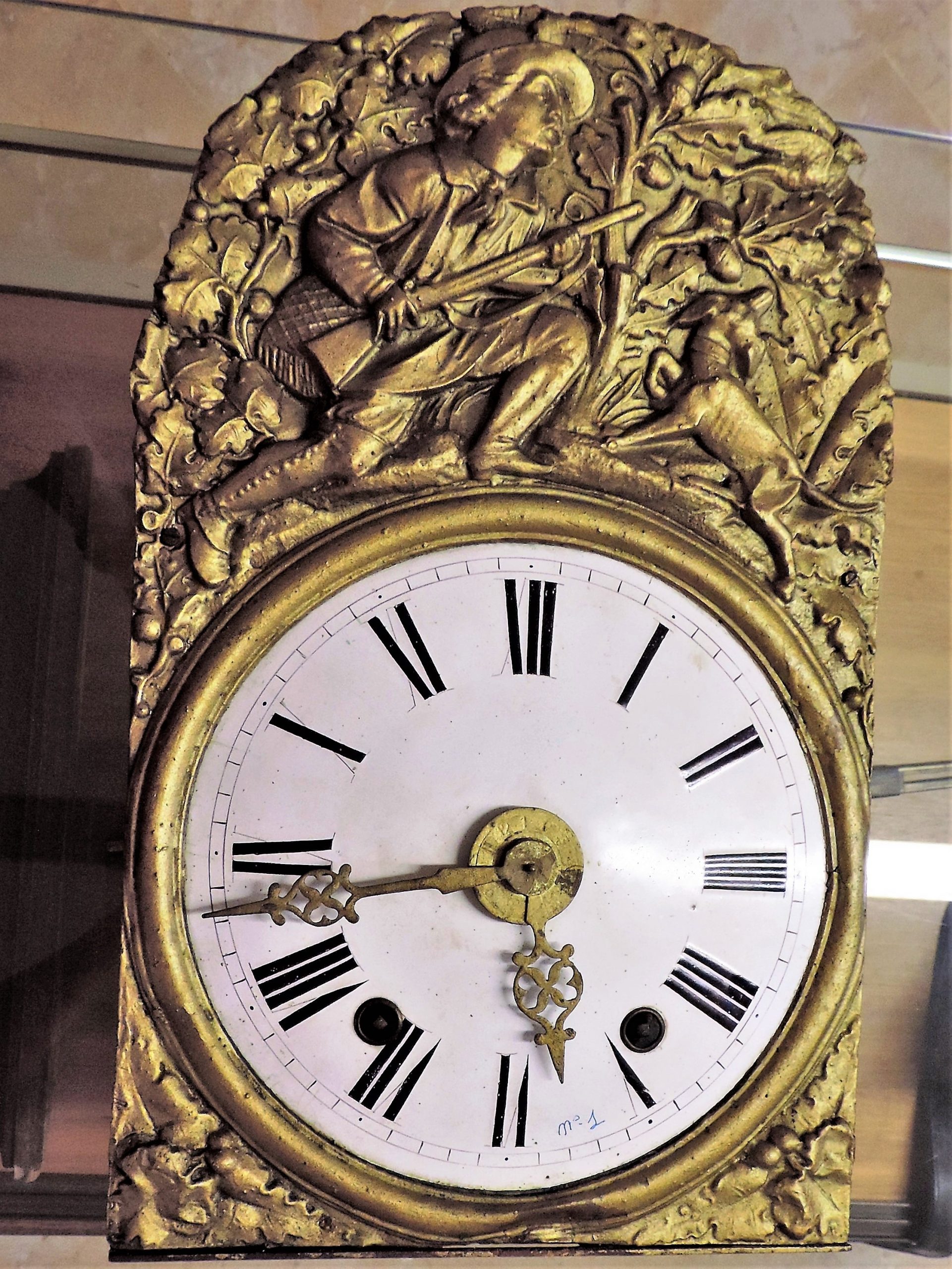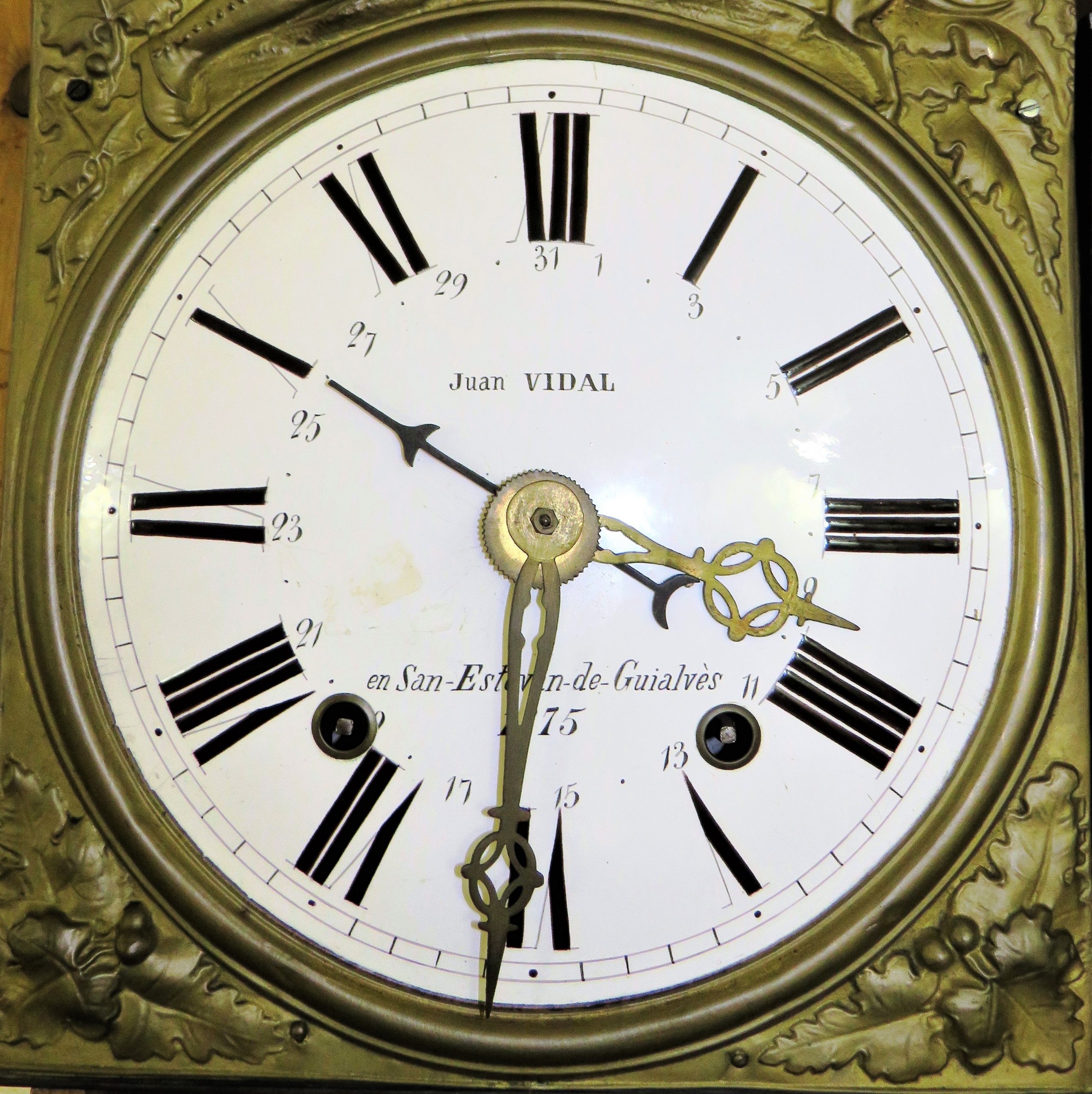 ESFERA i AGULLES : D’esmalt blanc amb números romans,les agulles de planxa de llautó estil Lluis XV.