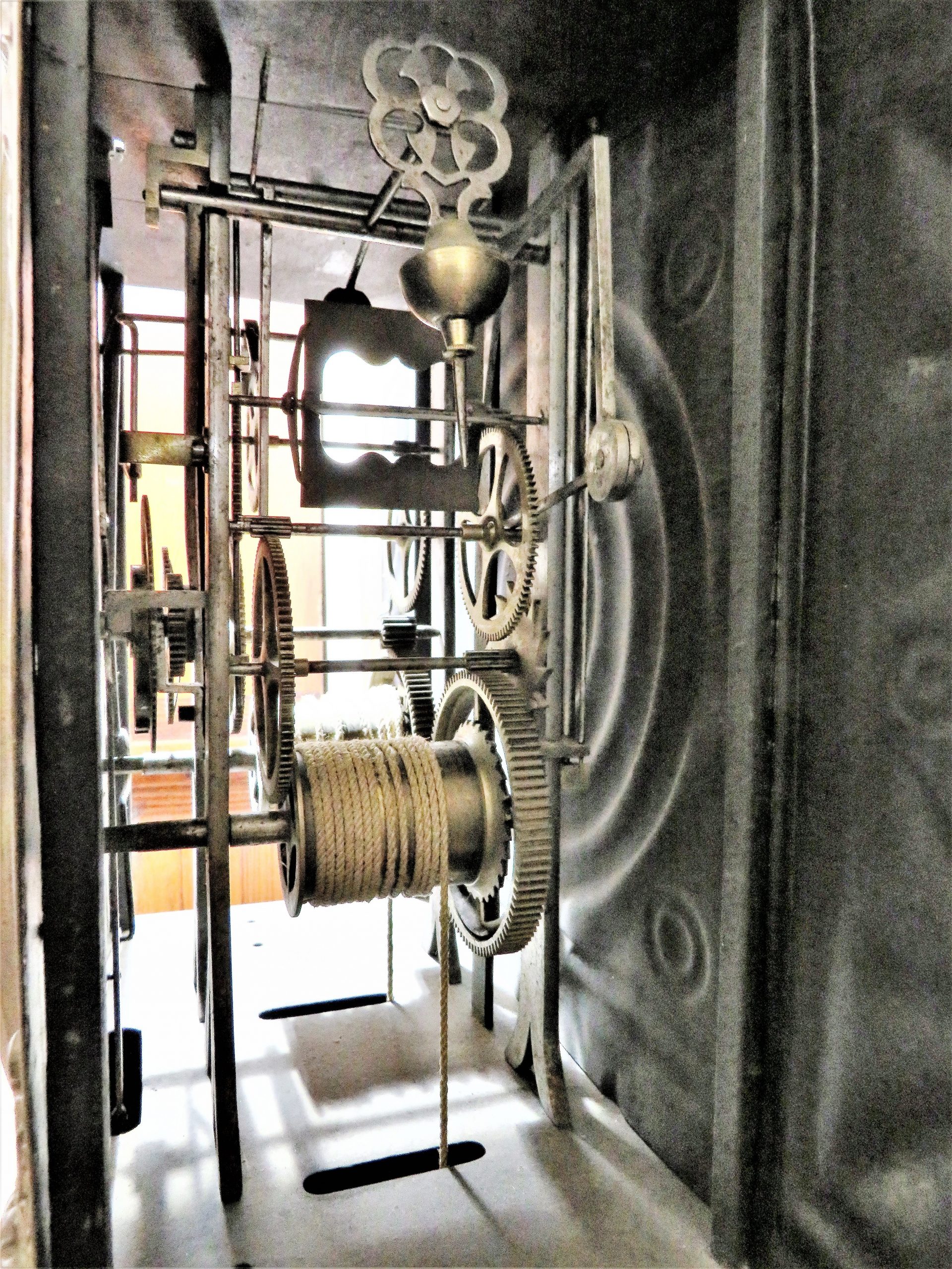 SONERIA : Hores,repetició d’hores i mitges hores .Un martell i una campana de bronze.