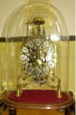 MATERIAL ; De bronze !’estructura del rellotge,el socol de fusta de noguera ,protegit per una campana de cristal!. MESURES .AMPLADA. …..36 cm……..ALTURA 50 cm……….FONDARÍA 22 cm.